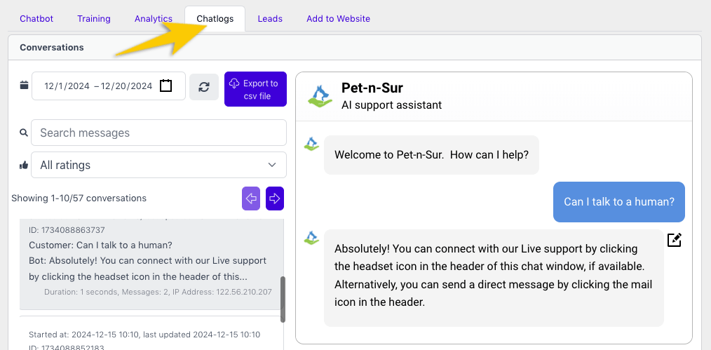 Select "Chatlogs" from the main/top tabs. You can browse conversations by date range; search conversations by keyword; or export conversation history as a csv file for further analysis or to import into other systems.