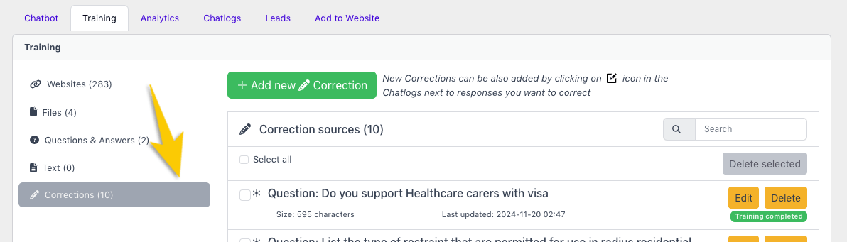 The best way to add a correction is via the transcript in the chatlogs. Find the conversation then click the edit icon to the righthand side of the response you want to correct