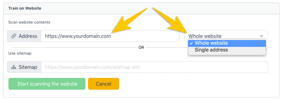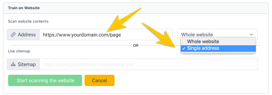 In the Address field, provide the URL and choose “Single address” from the right dropdown menu, then 'Start scanning the website'