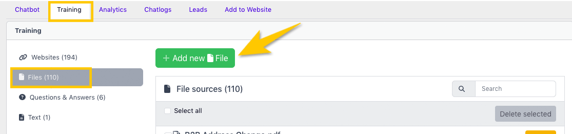 You can upload documents and spreadsheets to add training data to the knowledge base. Accepted file types are .PDF, .TXT, .DOC, .DOCX, CSV, .XLS, .XLSX.